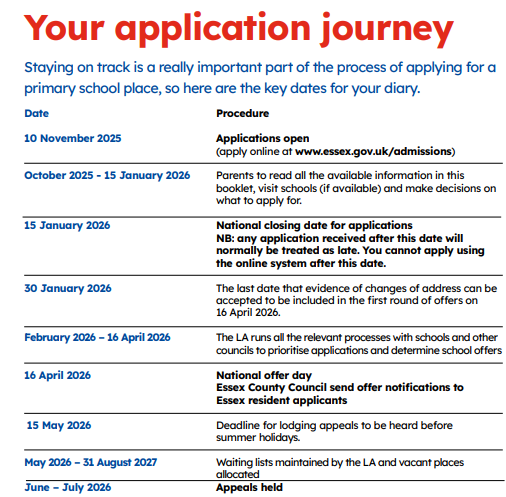 You can apply for primary (reception) school place at an Essex primary school between 10th November 2025 and 15 January 2026.