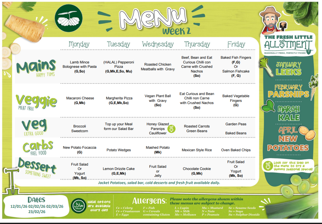 From Spring term 2026 the menu involves a three week rotating plan.